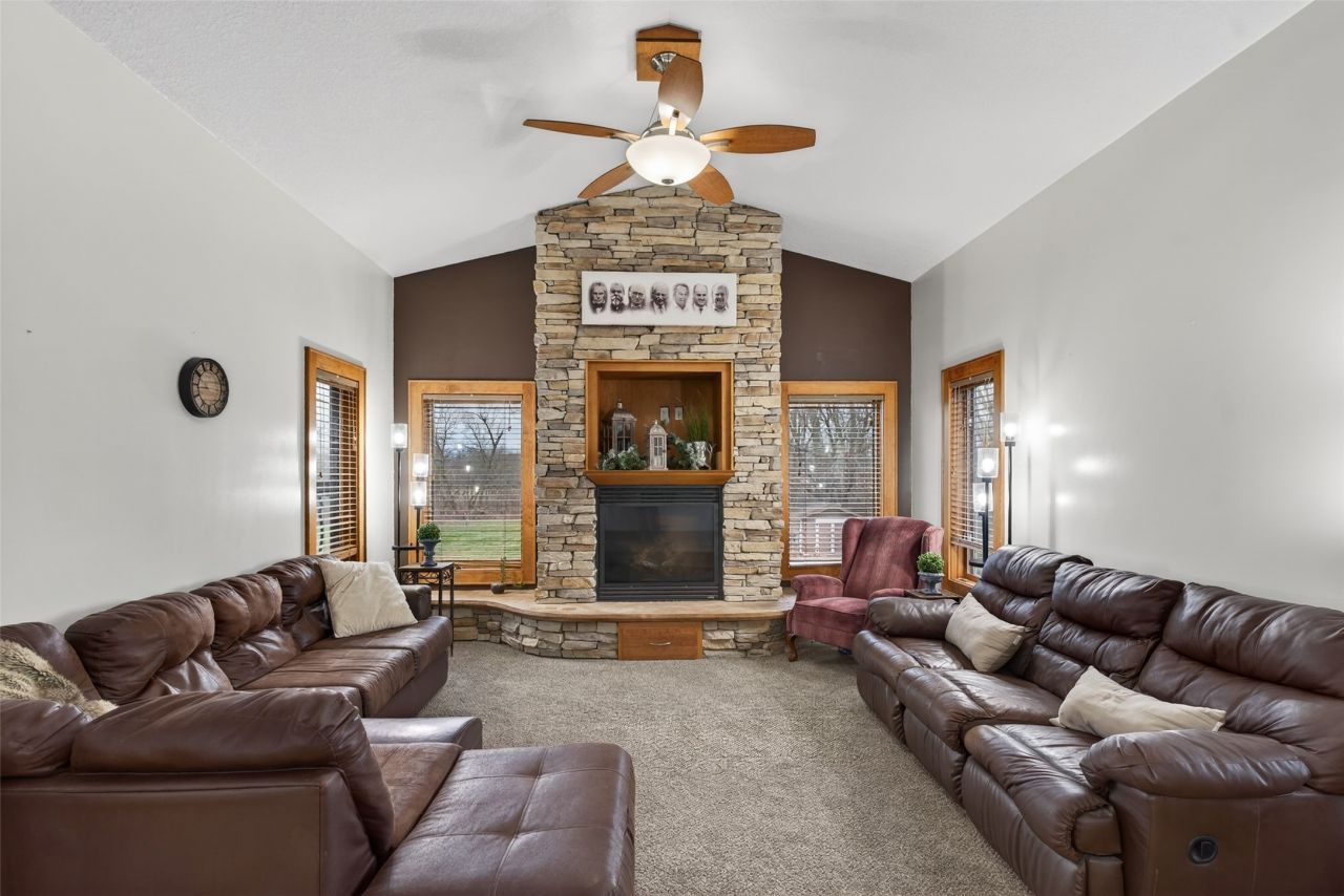 Beautifully updated 5 bed, 4 bath ranch on 1.2 acres with nearly 2,000 sq ft on the main level plus a finished walk-out basement. Enjoy peaceful prairie and timber views backing to 20 acres of HOA walking trails. Features hardwood floors, new blinds, fresh paint, updated carpet, stone fireplace, stainless appliances, and deck access off the dining area. Walk-out lower level offers full kitchen, bedrooms, bath and large living space?ideal for guests or multi-generational living. Major updates include 1-year-old roof, new geothermal system (2023), new deck stain, and new septic tank (inspection passed). Oversized 2-car garage, plenty of parking and quick access to I-35. Home sweet home in Cambridge!