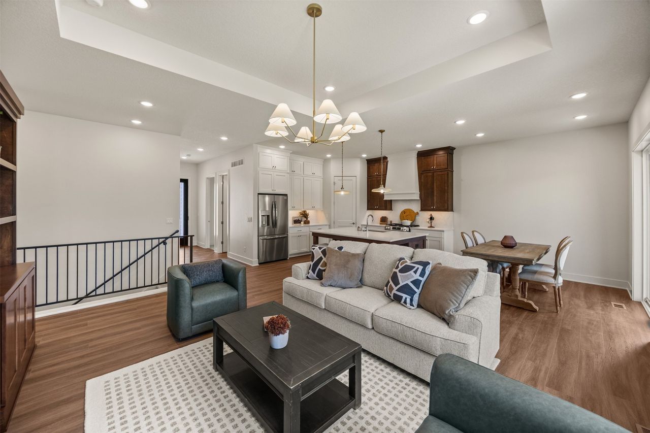 MODEL HOME FOR SALE AND MOVE IN READY! This stunning Baker Plan zero entry ranch combines luxury, comfort, and modern design throughout. Featuring 10' ceilings, 8' doors, and expansive windows overlooking a private, tree-lined backdrop, every detail has been thoughtfully crafted. The main level offers two bedrooms and two baths, including a beautiful primary suite with a tiled shower. The gourmet kitchen showcases cabinets to the ceiling, a large center island, walk-in pantry, and quartz countertops carried up the backsplash. Enjoy upgraded finishes throughout, including custom built-ins and designer lighting. The finished daylight lower level adds two additional bedrooms, a full bath, and a spacious family room complete with a wet bar and full-size refrigerator - perfect for entertaining. Exterior highlights include a covered composite deck, irrigation, and professional landscaping. All information obtained from seller and public records.