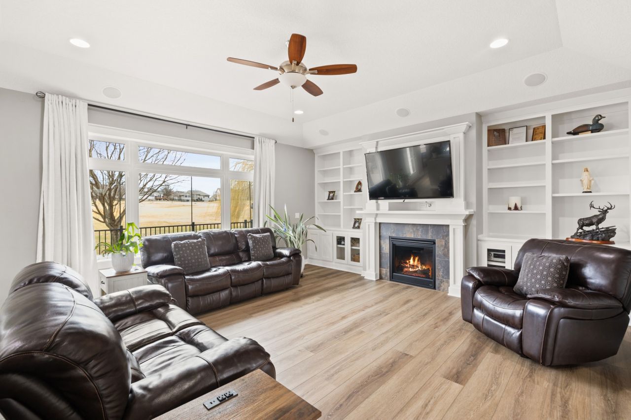 The main floor offers an inviting layout with a formal dining room, breakfast nook, and a large living room with custom built-in cabinetry and surround sound. The kitchen and living spaces flow seamlessly to an oversized deck overlooking the golf course, perfect for entertaining or relaxing.