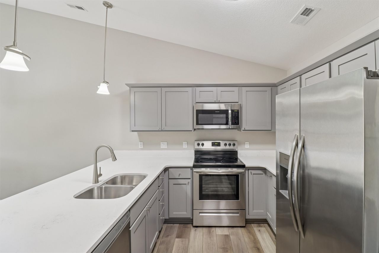 Better than new, zero-entry bi-attached home built in 2023 offering 2 bedrooms and 2 full bathrooms. This well-designed home features luxury vinyl plank flooring throughout, faux wood blinds in every room, and an open, functional layout. The kitchen comes fully equipped with all appliances included, making this home truly move in ready. Enjoy the convenience of a 2-car attached garage and low maintenance living. Additional features include gutter guards for added ease of maintenance. Property includes the remainder of the 5-year tax abatement.