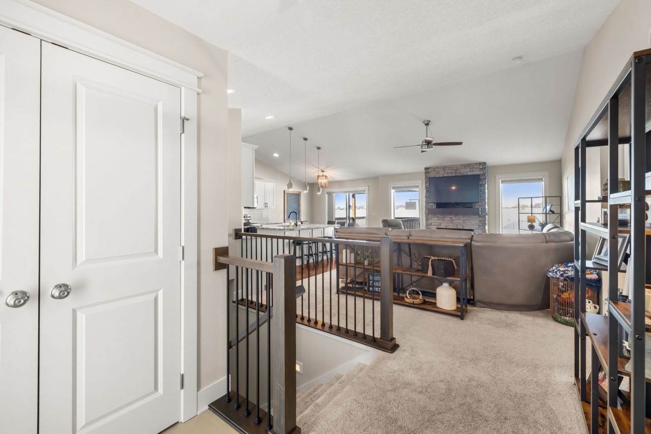 Stunning Modern Ranch Home. 4 beds, 3.5 baths, 3-car attached garage, Covered deck Energy-efficient 2x6 construction in a spacious single-level design with room to grow. Open-concept main level features vaulted living room ceilings, a striking stone fireplace, and a gourmet eat-in kitchen with hardwood floors, quartz countertops, large island/breakfast bar, tile backsplash, stainless steel appliances, hidden pantry, and recessed/pendant lighting. Smart split-bedroom layout for privacy: two bedrooms share a Jack-and-Jill bath on one wing; luxurious master suite on the opposite end with double vanity, tiled walk-in shower, and oversized walk-in closet. Convenient half bath and mudroom/laundry with built-in lockers. Finished lower level: 1,100+ sq ft including family room with wet bar, full bath, 4th bedroom, and ample storage. Premium finishes, thoughtful flow, and versatile space. Move-in ready!
