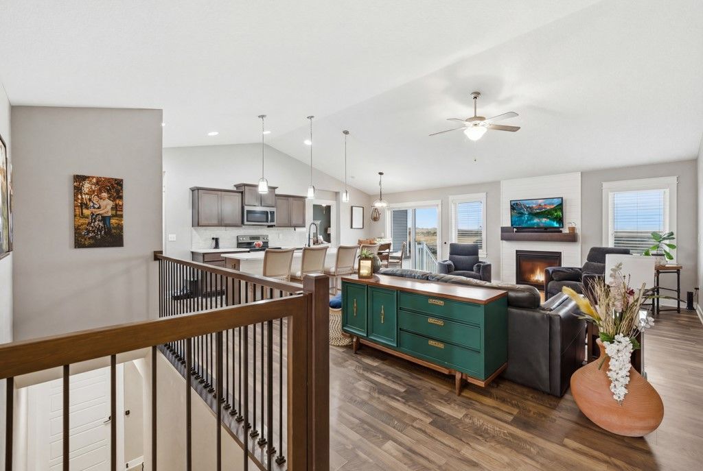 Looking for a home with no neighbors directly behind you and future park views? This Happe Homes resale backs directly to the upcoming Pleasantview Park, which will feature walking trails and ponds for you to enjoy. Step inside to an open main living space highlighted by vaulted ceilings that flow through the kitchen and living room. The kitchen offers generous cabinet and countertop space, an island overlooking the living room, and a convenient coffee bar area next to the refrigerator, making it a great space for everyday living and entertaining. The main level features three bedrooms, including a spacious primary suite with a tray ceiling, dual sinks, tiled shower, and walk in closet. Two additional bedrooms and a full bathroom are located on the opposite side of the home, offering a functional layout for family or guests. Downstairs, the finished basement is built for entertaining with a large living area wired for a projector and surround sound, along with a bar area perfect for hosting. The lower level also includes an additional bedroom and a third bathroom featuring a floor to ceiling tiled shower. Step outside to enjoy the fully fenced backyard and patio that will overlook the future ponds planned for completion later this year. Additional features include a heated garage with in floor heat, tankless water heater, and water softener.
