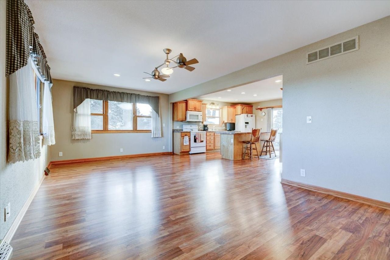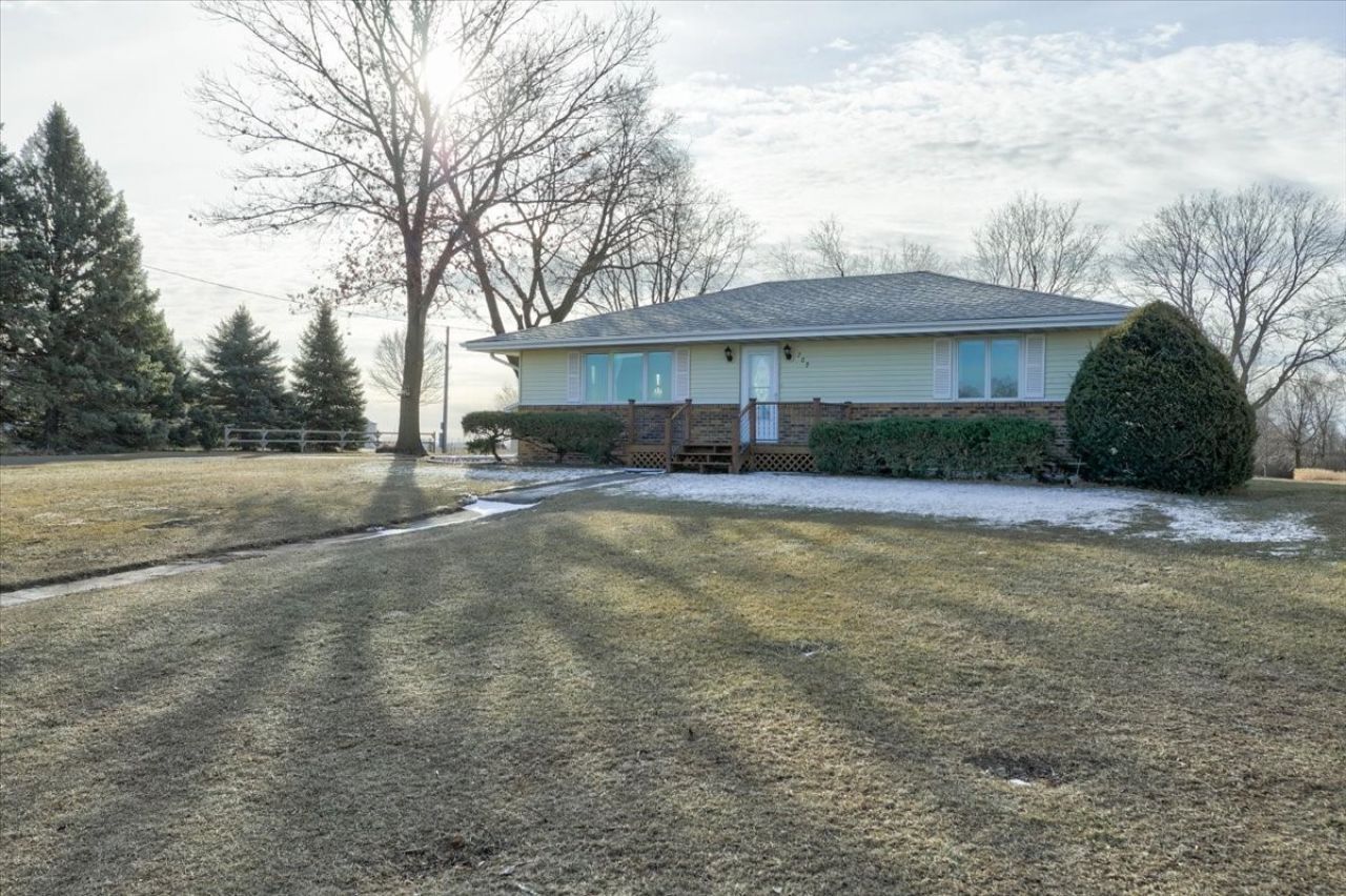Nearly 4 acres with mature trees, three garage spaces, and room to live, work, and play?this is a rare acreage opportunity. This ranch-style home offers versatile living spaces perfect for hobbies, storage, or entertaining. The main level features a welcoming living room that flows into the dining area and kitchen, creating an open and functional layout. The kitchen includes a center island and a built-in wall of cabinetry for excellent storage, along with abundant natural light and a patio door leading to an east-facing deck. Two bedrooms are located on the main floor, including a primary ensuite, plus an additional full bath and convenient main-floor laundry. A standout feature is the knotty pine fun room that connects the attached garage to the home, offering a cozy second living space with rustic charm and access to a second deck and patio complete with a Sunsetter awning?perfect for summer enjoyment. The finished lower level adds 689 sq ft and includes a kitchenette, third living room, bathroom, and a non-conforming bedroom ideal for guests, a home office, or recreation. Garage space is abundant with a 2-car attached garage plus two 2-car detached garages. Major updates include a new roof in 2021 and HVAC in 2022. Enjoy the privacy of acreage living with the convenience of being close to town.