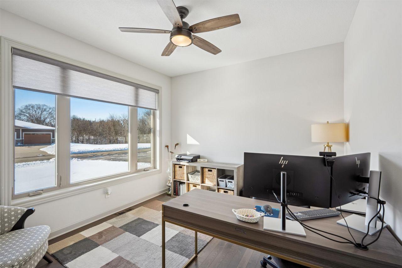 Stunning duplex-style townhome in Granger designed for elevated living and effortless entertaining. The open-concept main level offers a seamless flow between the kitchen, dining, and living spaces, creating the perfect setting for hosting. The chef's kitchen features Bosch appliances, including a cooktop and wall oven, abundant cabinetry, and generous prep space. A stone gas fireplace with custom built-ins anchors the living room, while expansive windows flood the home with natural light. The main level also includes a private primary suite with tiled shower, a front office, mudroom, laundry, half bath, and a large covered deck ideal for relaxing or gathering with guests. The lower level expands your entertaining options with a spacious family room and wet bar, plus two large bedrooms and a full bath. A unique split rear entry leads to a patio serving both levels. This is finished with a three-car attached garage. HOA covers lawn care and snow removal for true low-maintenance living.